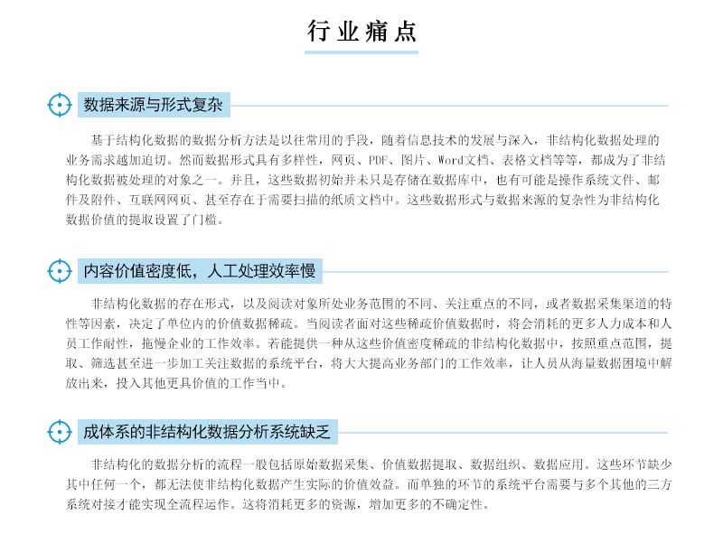 基于垂直領域的行業知識,依托OCR、自然語言處理、知識圖譜等前沿技術,構建從海量非結構化數據中提取關鍵信息的平臺,包括原生關鍵信息精準抽取、派生關鍵數據自動推理等能力。從而提升工作效率,降低人工成本,擴大數據覆蓋度及增強數據時效性。