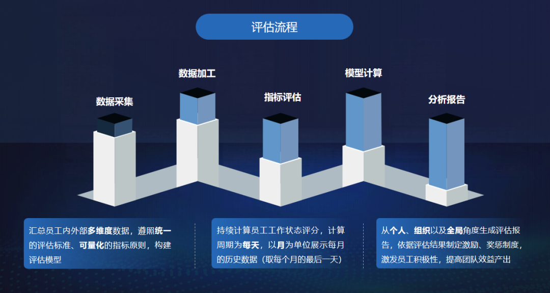 系統實現多源業務數據至評估結果的全流程設計,評估結果客觀可靠。系統每日持續計算員工工作狀態評分,并以月為單位展示每月的歷史數據,幫助企業實時監控員工工作狀態,及時發現問題并進行調整。